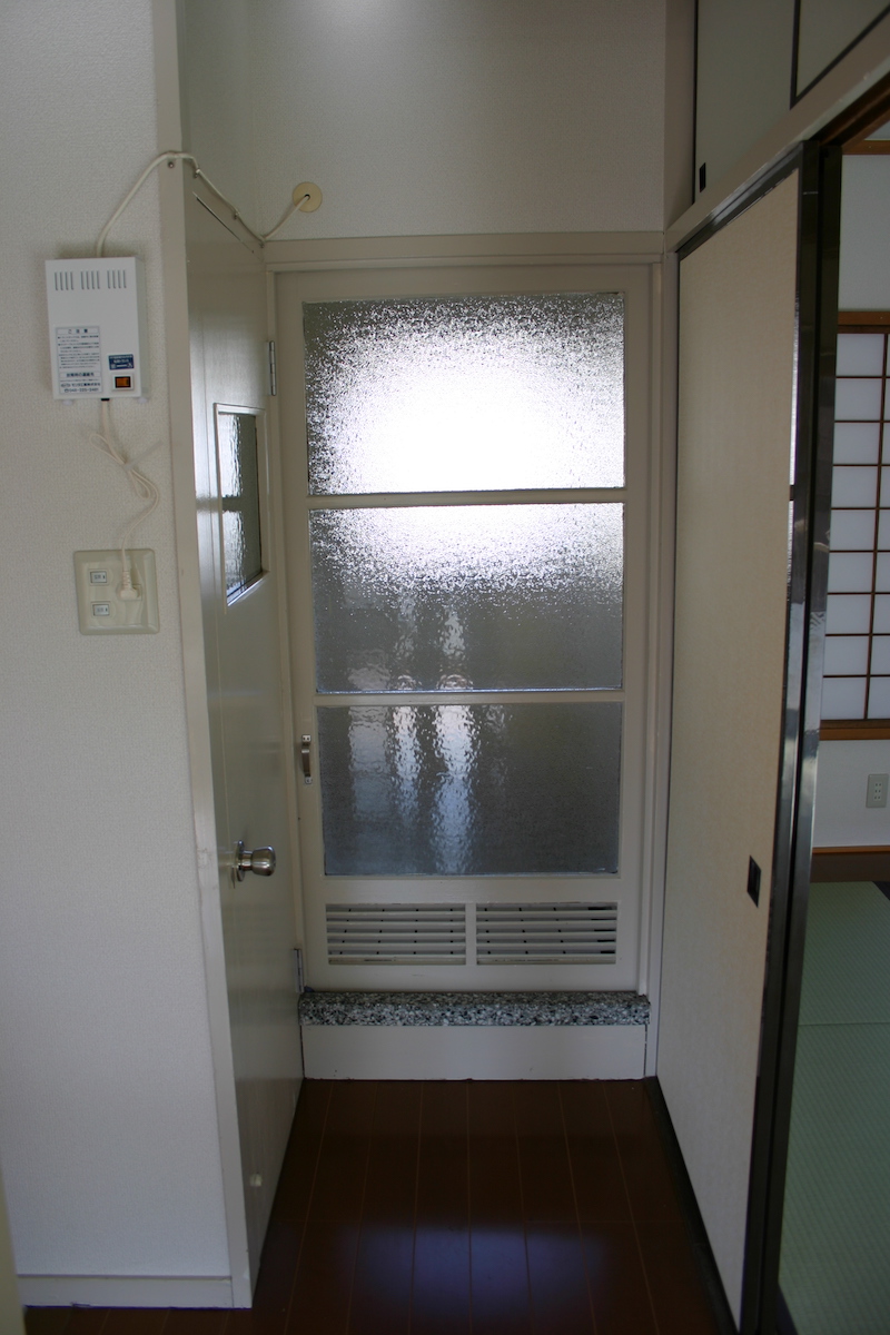浴室の扉がなんとオリジナルのまま残っていました。木製なのに腐らずによくもっているなあと感心。ジントギの跨ぎ部分もそのままです。