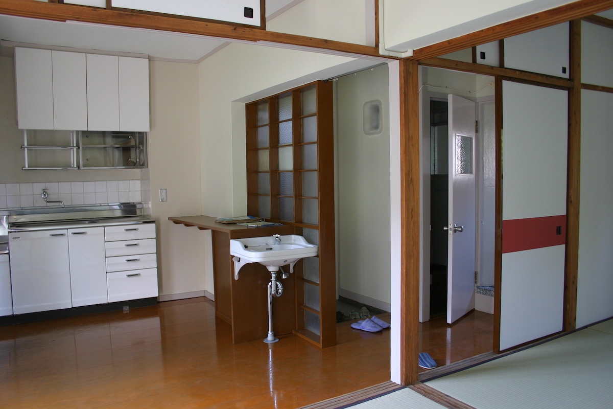 そよ風が心地よい台所。換気扇用の穴はなく、小窓に換気扇を設置するのが一般的でした。壁から直接蛇口が出ているのがこの時代の団地の特徴。