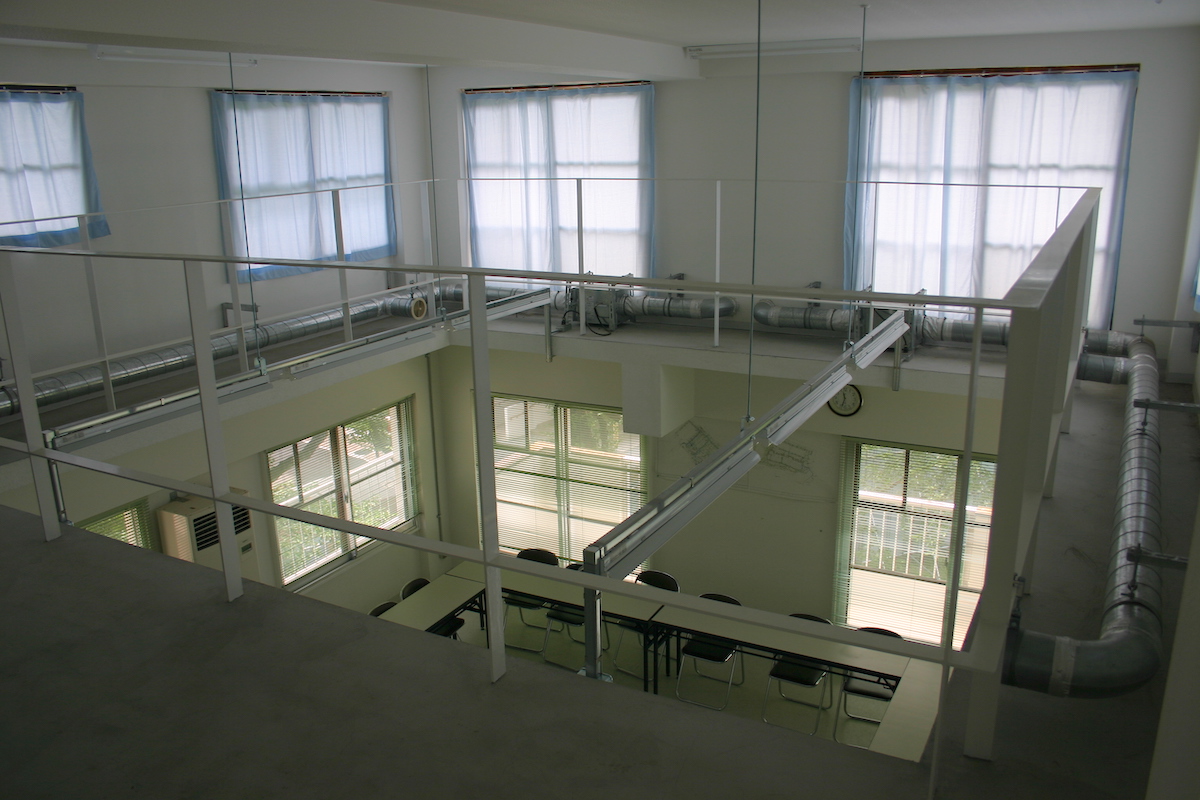 床スラブがぶち抜かれ、吹き抜けの会議室ができていました。