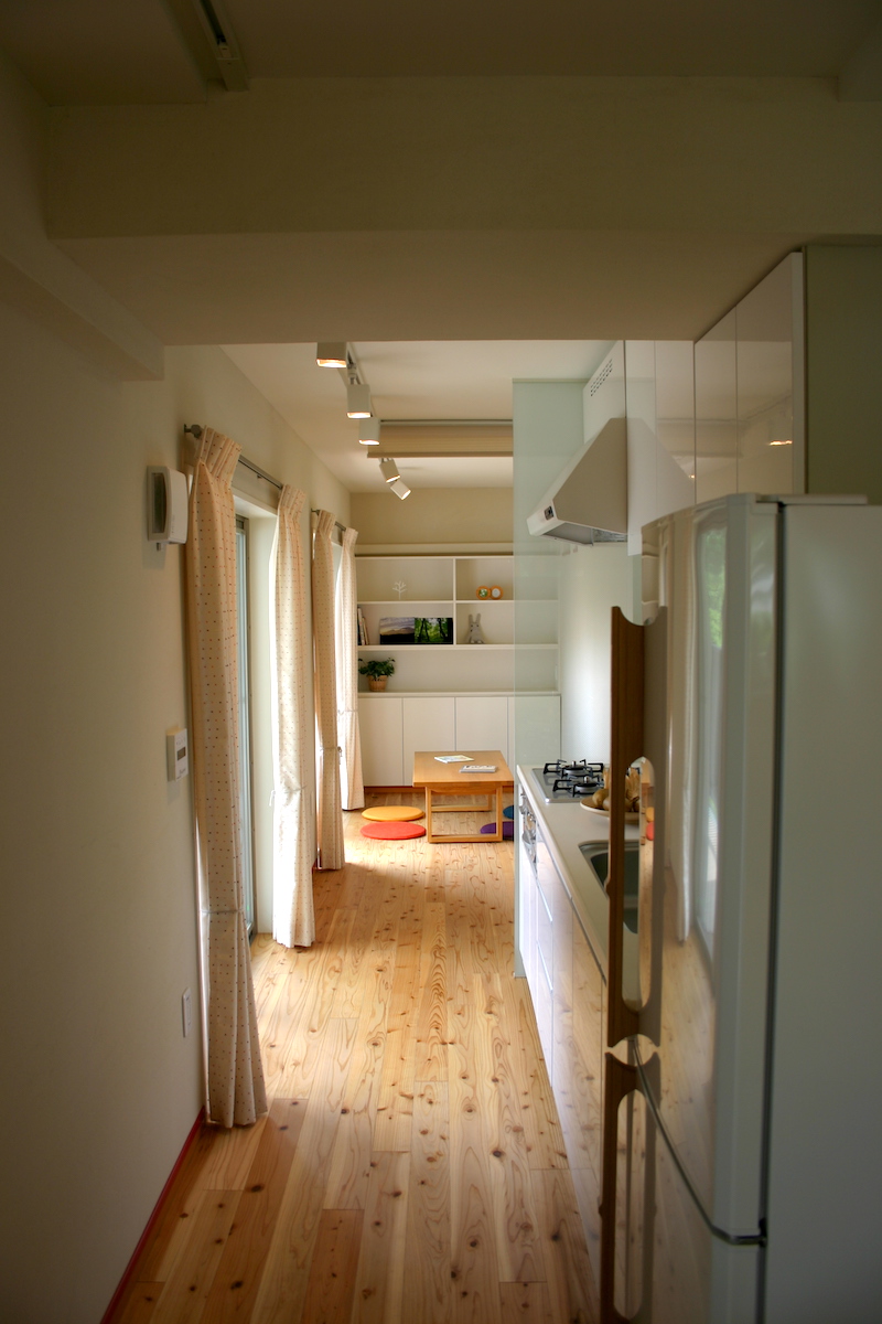 キッチンです。奥に浴室がありますが、扉が2方向についており、玄関からも直接入れます。そっち側から出てる頭が写り込んでいますね。